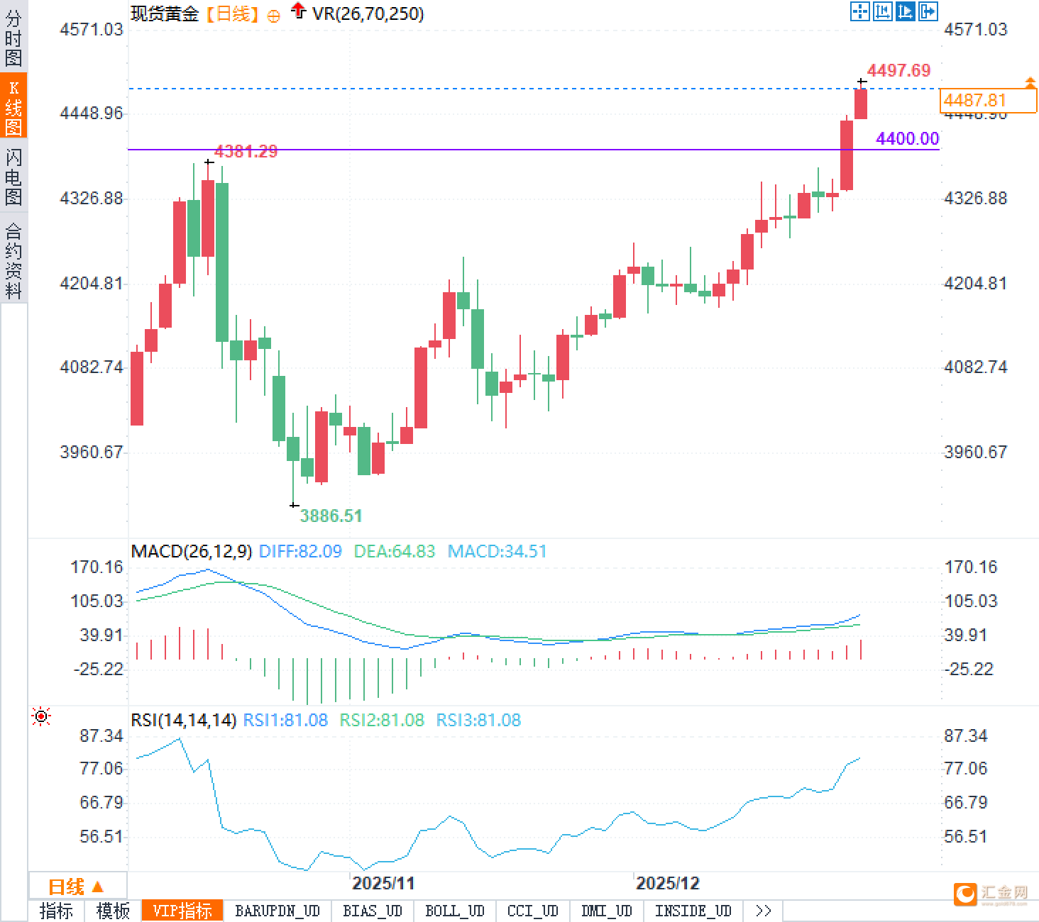 从技术形态来看,金价在上冲4500区域后出现高位整理,并未出现急涨急跌的典型“见顶信号”。当前关键支撑位落在4400附近,分析认为只要价格能在此上方维持韧性,整体上行结构依然完整。