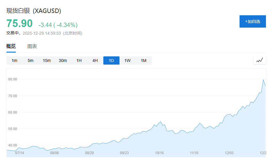 白银一度突破80美元历史大关,年内涨幅超过150%,同样有望创下自1979年以来最佳年度表现。