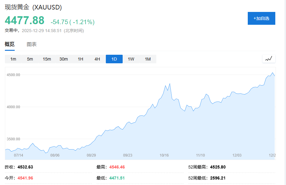 12月24日,现货黄金首次突破4500美元,今年累涨约70%,有望创1979年来最佳年度表现。